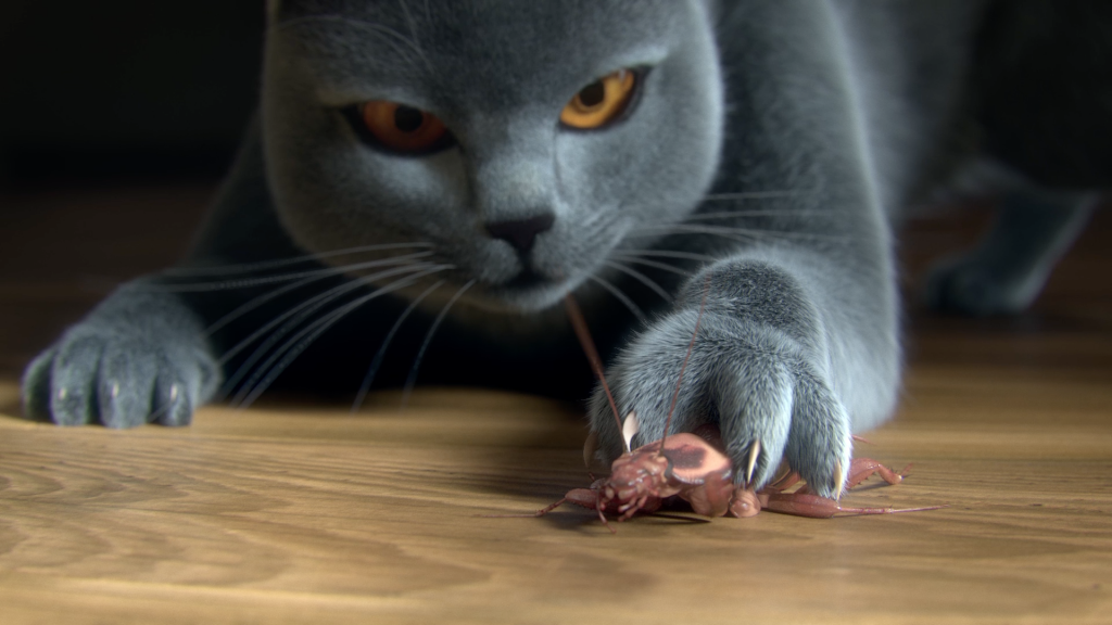 Un chat trouve dans le jeu et la chasse d’un cafard une échappatoire à l’enfermement et à la routine imposée par sa vieille maîtresse.